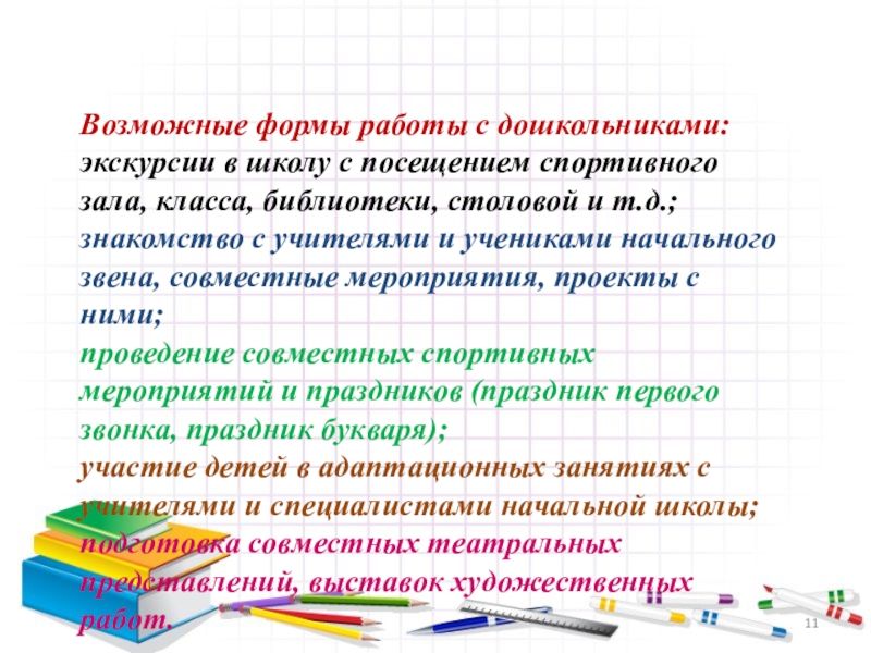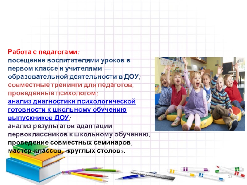 Слайд 13 совместные родительские собрания с педагогами ДОУ и учителями школы;