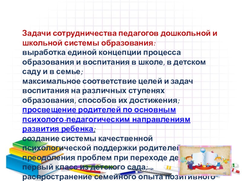 Слайд 10Задачи сотрудничества педагогов дошкольной и школьной системы образования:
