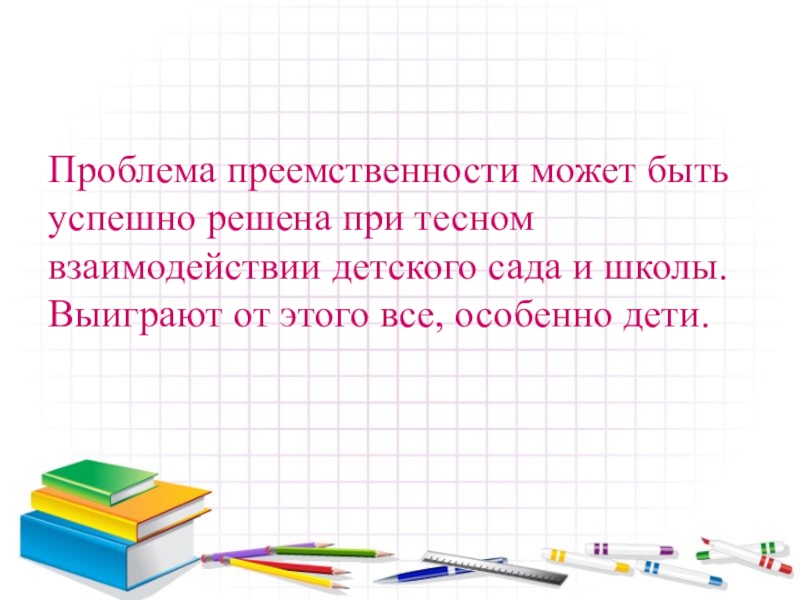 Слайд 18Проблема преемственности может быть успешно решена при тесном взаимодействии детского сада