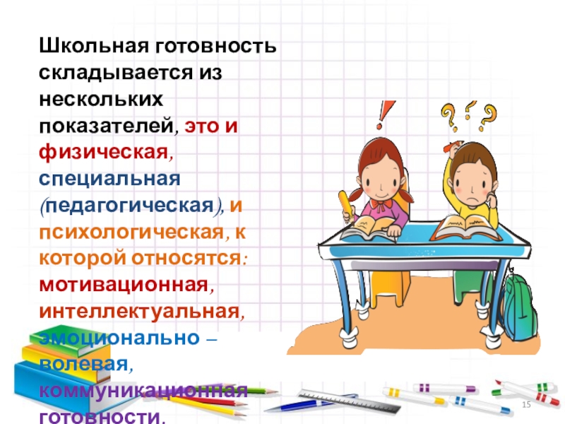 Школьная готовность складывается из нескольких показателей, это и физическая, специальная (педагогическая),