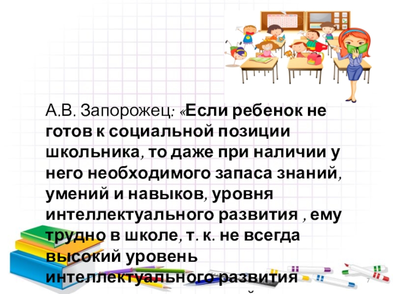 Слайд 7А.В. Запорожец: «Если ребенок не готов к социальной позиции школьника, то