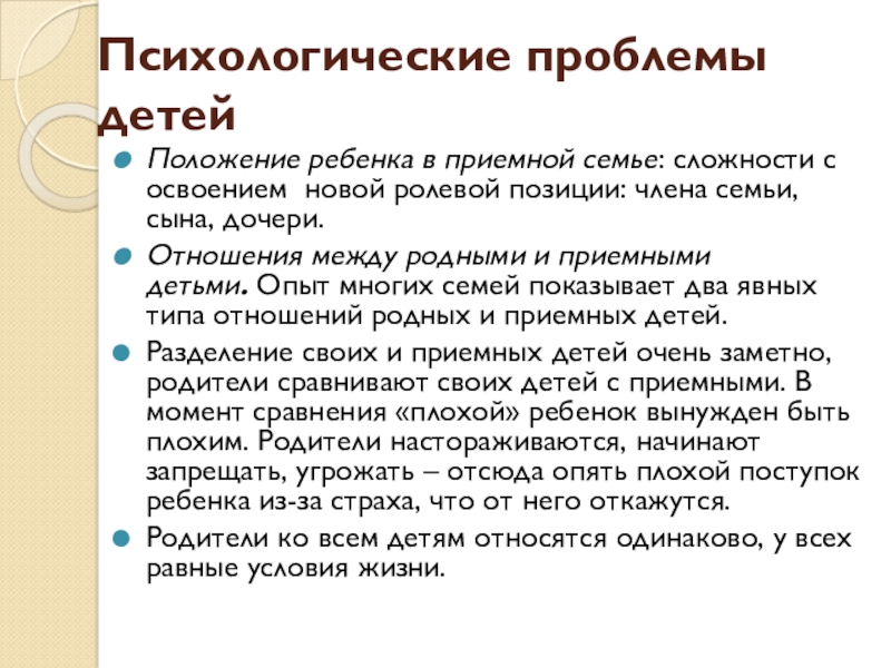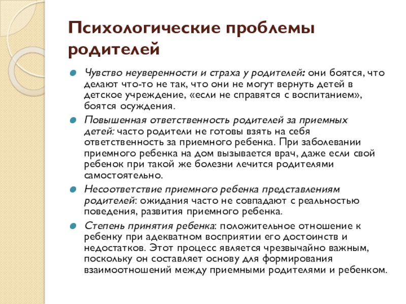 Повышенная ответственность родителей за приемных детей: часто родители не готовы взять на себя ответственность за приемного ребенка. При заболевании приемного ребенка на дом вызывается врач, даже если свой ребенок при такой же болезни лечится родителями самостоятельно.