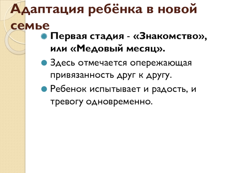 Степень принятия ребенка: положительное отношение к ребенку при адекватном восприятии его достоинств и недостатков. Этот процесс является чрезвычайно важным, поскольку он составляет основу для формирования взаимоотношений между приемными родителями и ребенком.