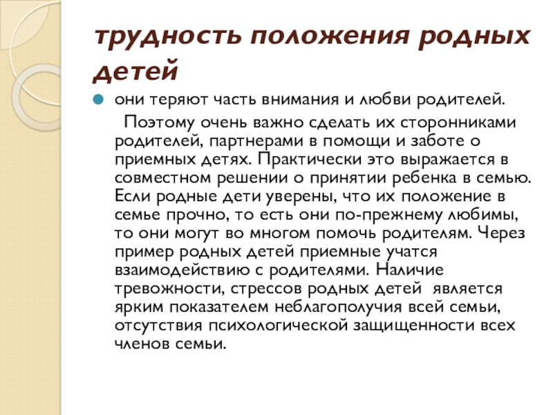 Поэтому очень важно сделать их сторонниками родителей, партнерами в помощи и заботе о приемных детях. Практически это выражается в совместном решении о принятии ребенка в семью. Если родные дети уверены, что их положение в семье прочно, то есть они по-прежнему любимы, то они могут во многом помочь родителям. Через пример родных детей приемные учатся взаимодействию с родителями. Наличие тревожности, стрессов родных детей является ярким показателем неблагополучия всей семьи, отсутствия психологической защищенности всех членов семьи.