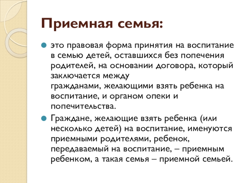 Граждане, желающие взять ребенка (или несколько детей) на воспитание, именуются приемными родителями, ребенок, передаваемый на воспитание, – приемным ребенком, а такая семья – приемной семьей.