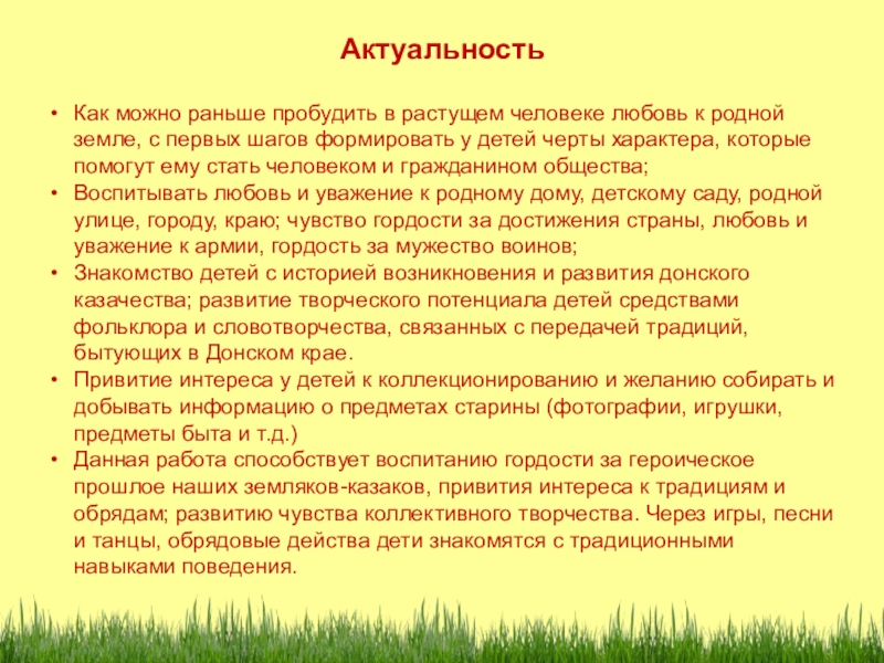 Данная работа способствует воспитанию гордости за героическое прошлое наших земляков-казаков, привития интереса к традициям и обрядам; развитию чувства коллективного творчества. Через игры, песни и танцы, обрядовые действа дети знакомятся с традиционными навыками поведения.