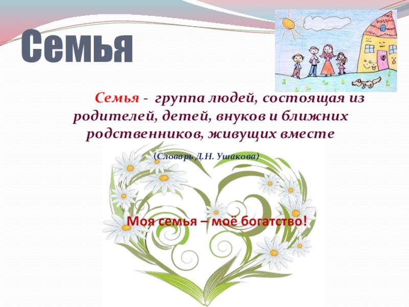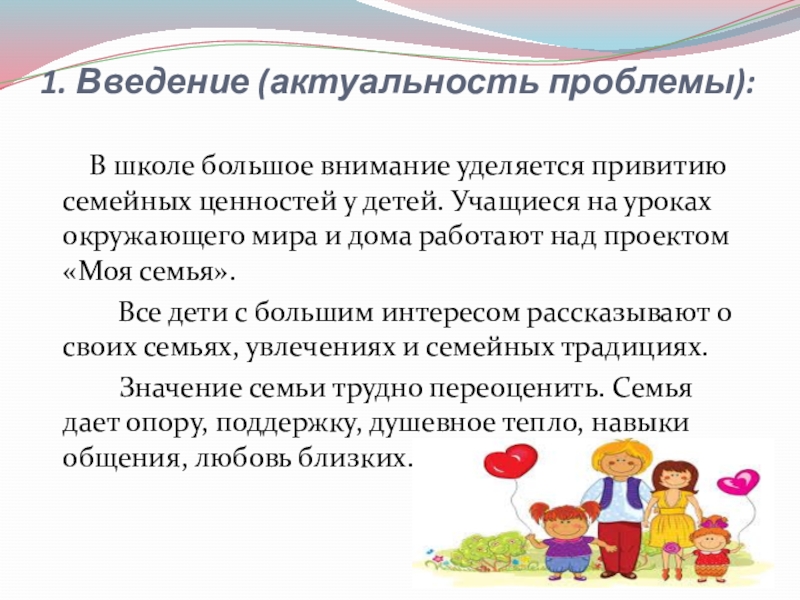 Значение семьи трудно переоценить. Семья дает опору, поддержку, душевное тепло, навыки общения, любовь близких.