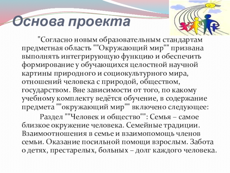 Раздел ""Человек и общество"": Семья – самое близкое окружение человека. Семейные традиции. Взаимоотношения в семье и взаимопомощь членов семьи. Оказание посильной помощи взрослым. Забота о детях, престарелых, больных – долг каждого человека.