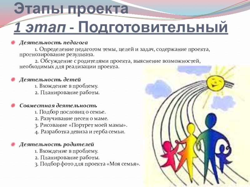 1. Определение педагогом темы, целей и задач, содержание проекта, прогнозирование результата.