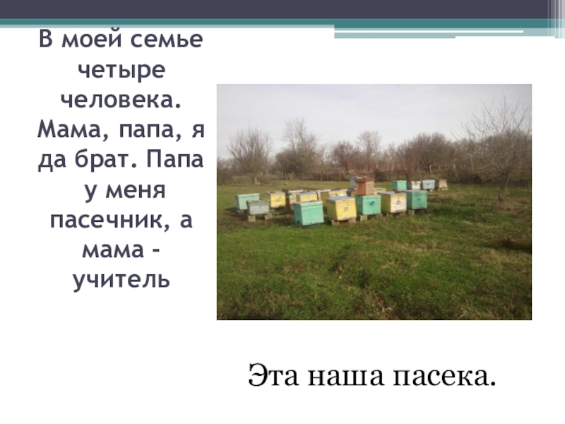В моей семье четыре человека. Мама, папа, я да брат. Папа   у меня пасечник, а