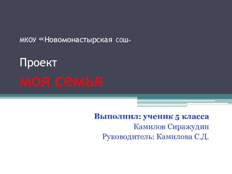 МКОУ «Новомонастырская СОШ»  Проект  моя семьяВыполнил: ученик 5 классаКамилов СиражудинРуководитель: Камилова С.Д.