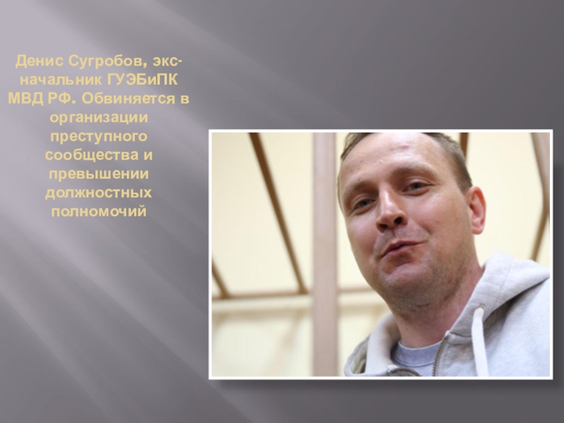 Слайд 24Денис Сугробов, экс-начальник ГУЭБиПК МВД РФ. Обвиняется в организации преступного сообщества