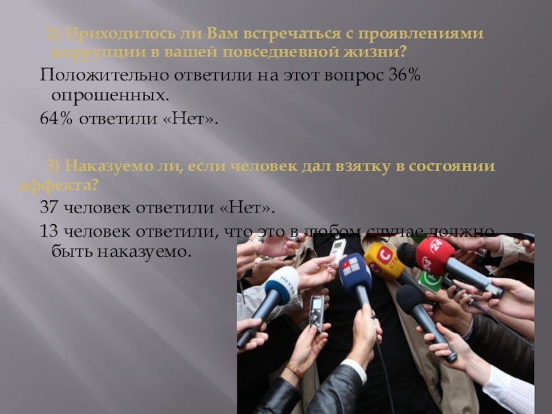 Слайд 37 2) Приходилось ли Вам встречаться с проявлениями коррупции в вашей повседневной