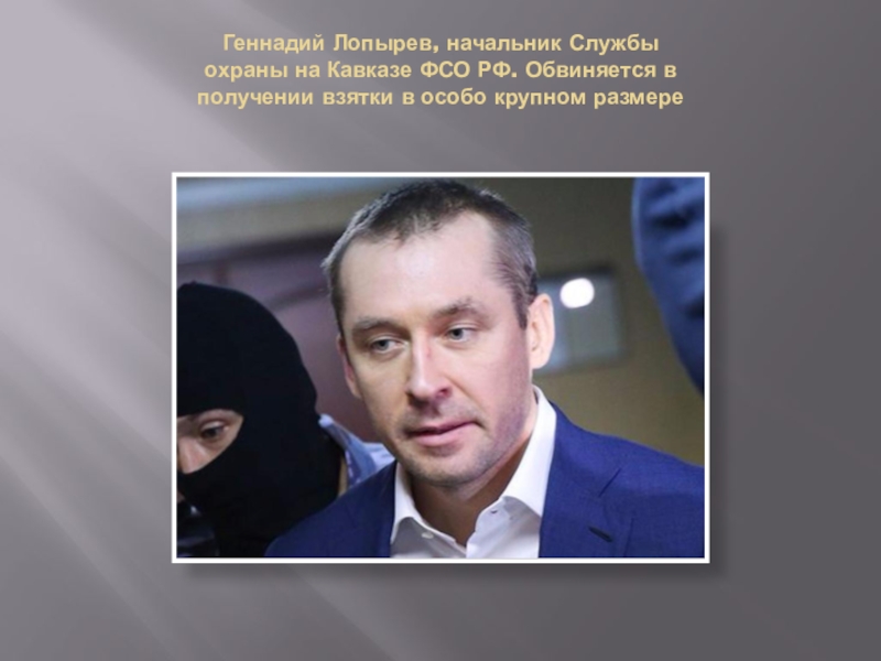 Слайд 23Геннадий Лопырев, начальник Службы охраны на Кавказе ФСО РФ. Обвиняется в