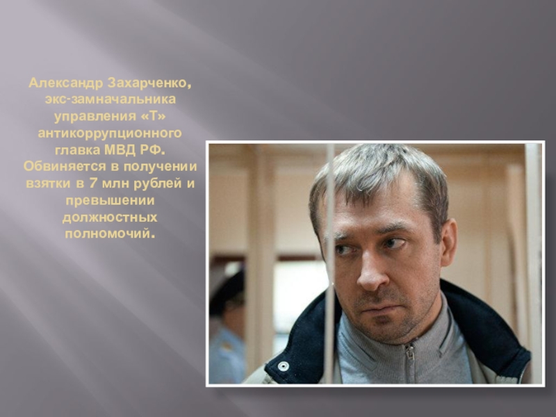 Слайд 21Александр Захарченко, экс-замначальника управления «Т» антикоррупционного главка МВД РФ. Обвиняется в