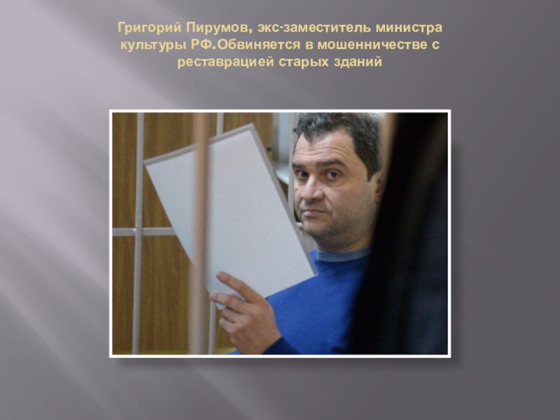 Слайд 26Григорий Пирумов, экс-заместитель министра культуры РФ.Обвиняется в мошенничестве с реставрацией старых