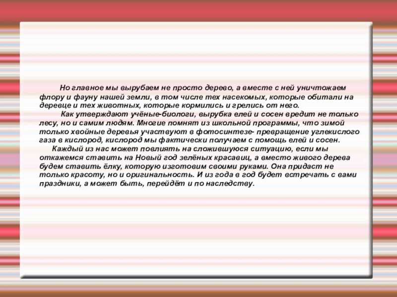 Как утверждают учёные-биологи, вырубка елей и сосен вредит не только лесу, но и самим людям. Многие помнят из школьной программы, что зимой только хвойные деревья участвуют в фотосинтезе- превращение углекислого газа в кислород, кислород мы фактически получаем с помощь елей и сосен.