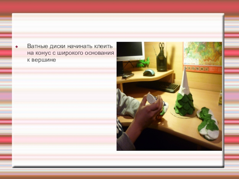 Ватные диски начинать клеить на конус с широкого основания к вершине