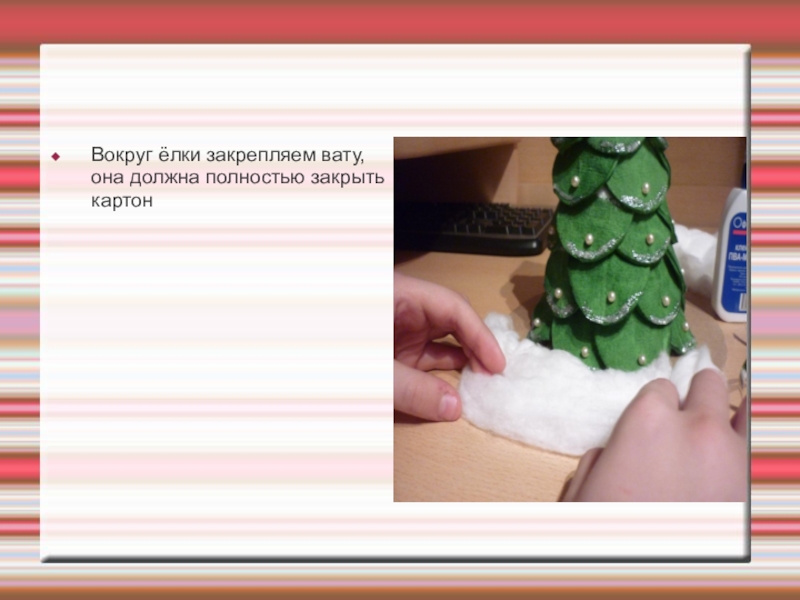 Вокруг ёлки закрепляем вату, она должна полностью закрыть картон