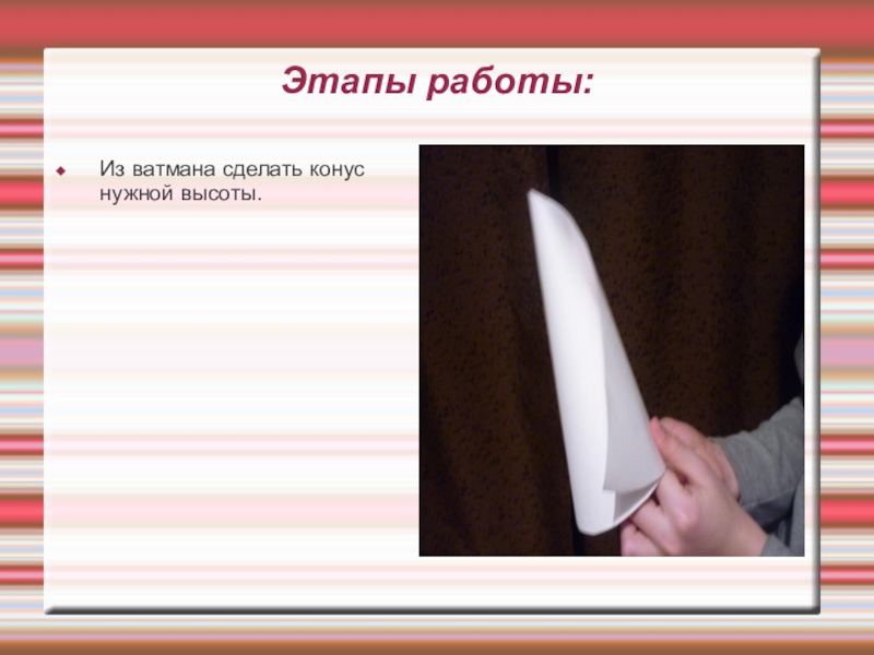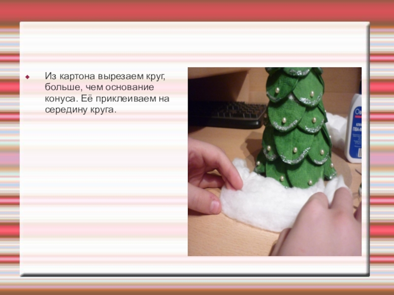 Из картона вырезаем круг, больше, чем основание конуса. Её приклеиваем на