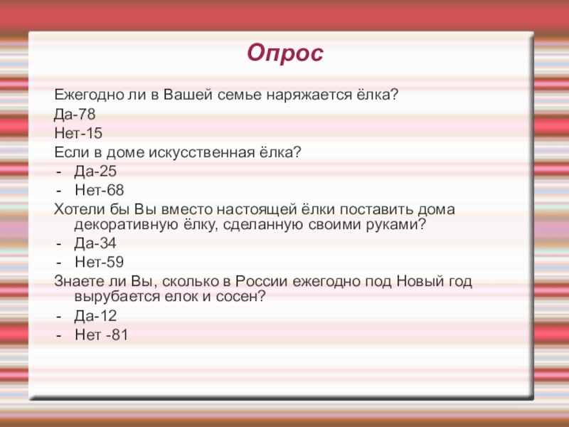 где нет искусственных, а большая часть опрошенных не хотела бы вместо настоящей елки ставить декоративную ёлку, сделанную своими руками. Моя задача – убедить людей в преимуществах декоративной ёлочки, главное из которых – спасение елей, сосен.