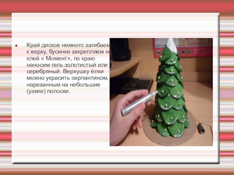 Момент», по краю наносим гель золотистый или серебряный. Верхушку ёлки можно украсить серпантином, нарезанным на небольшие (узкие) полоски.