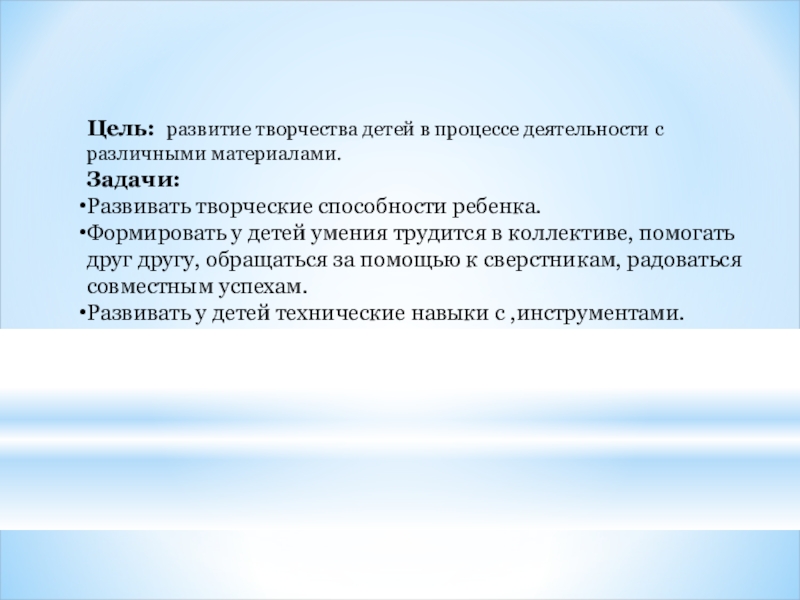 Слайд 2Цель: развитие творчества детей в процессе деятельности с различными материалами.