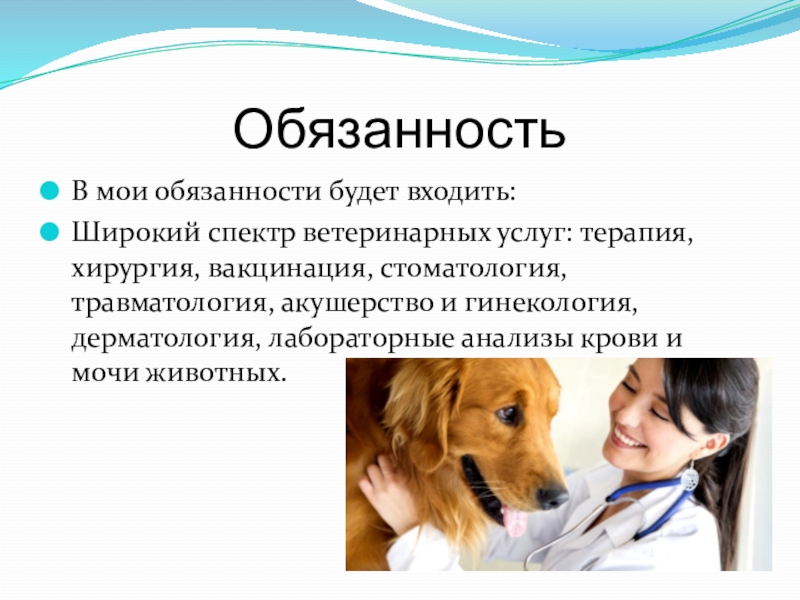 ОбязанностьВ мои обязанности будет входить:Широкий спектр ветеринарных услуг: терапия, хирургия, вакцинация, стоматология, травматология, акушерство и гинекология, дерматология,