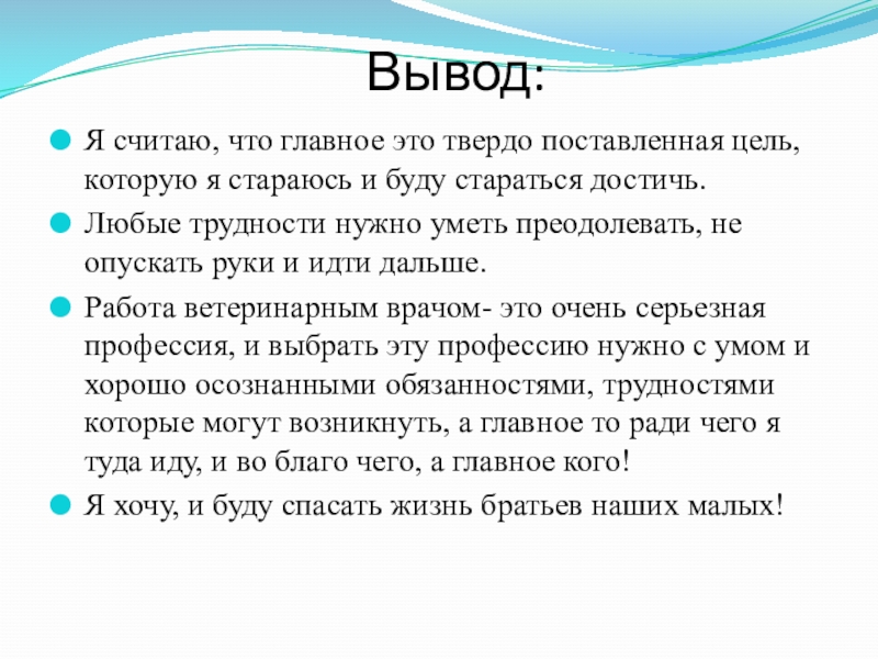 Вывод:Я считаю, что главное это твердо поставленная цель, которую я стараюсь и буду стараться достичь.Любые трудности нужно