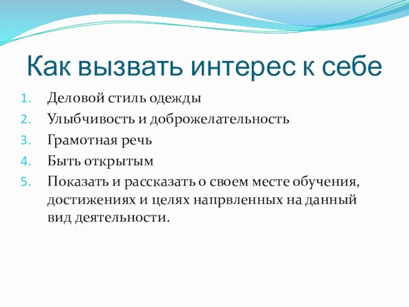 Как вызвать интерес к себеДеловой стиль одеждыУлыбчивость и доброжелательностьГрамотная речьБыть открытым Показать и рассказать о своем месте
