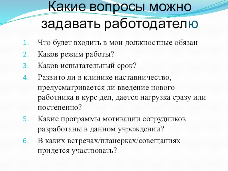 Какие вопросы можно задавать работодателюЧто будет входить в мои должностные обязанКаков режим работы?Каков испытательный срок? Развито ли в клинике
