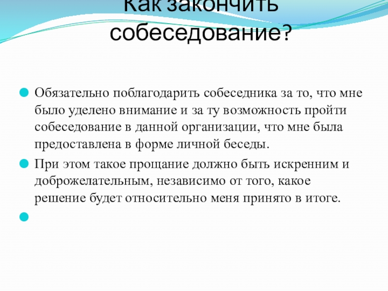 Как закончить собеседование?Обязательно поблагодарить собеседника за то, что мне было уделено внимание и за ту возможность пройти