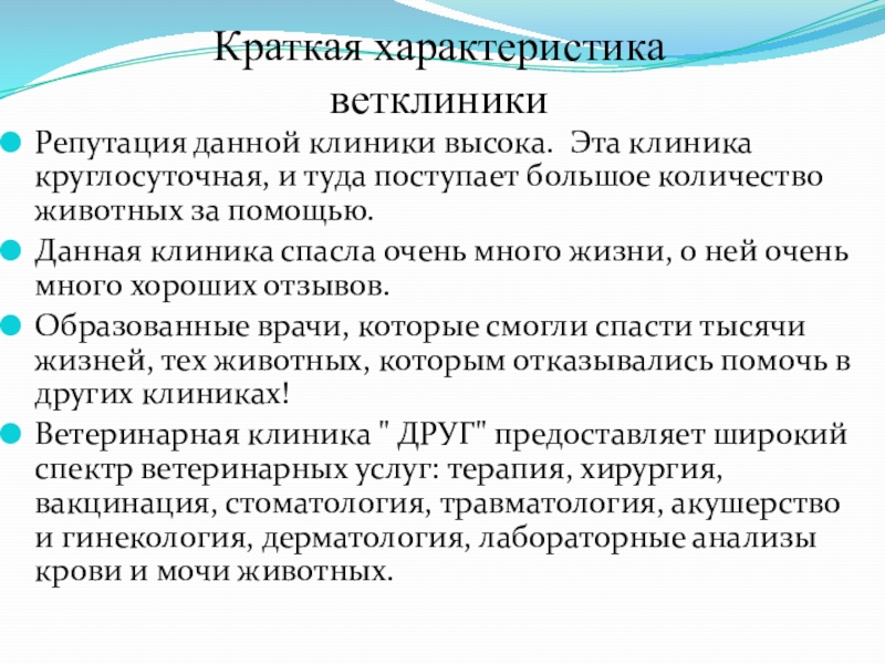 Краткая характеристика ветклиникиРепутация данной клиники высока. Эта клиника круглосуточная, и туда поступает большое количество животных за помощью.Данная клиника спасла очень много жизни, о ней очень много хороших отзывов.Образованные врачи, которые смогли спасти тысячи жизней, тех животных,