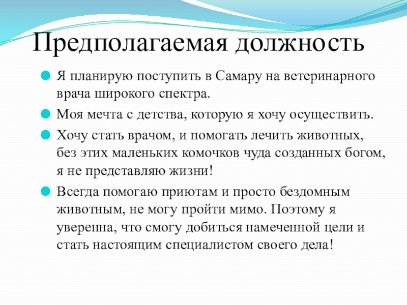 Предполагаемая должностьЯ планирую поступить в Самару на ветеринарного врача широкого спектра.Моя мечта с детства, которую я хочу