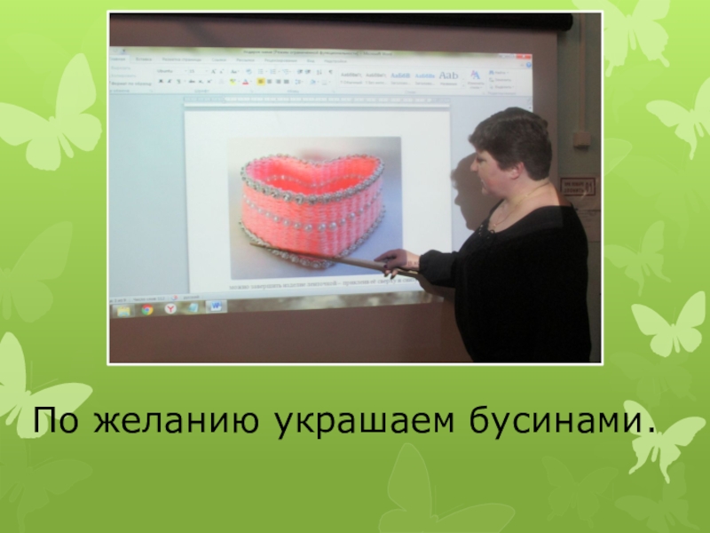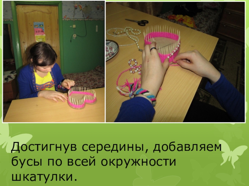 Слайд 9Достигнув середины, добавляем бусы по всей окружности шкатулки.