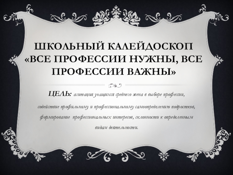 ЦЕЛЬ: агитация учащихся среднего звена в выборе профессии, содействие профильному и профессиональному самоопределению подростков, формирование профессиональных интересов, склонности к определенным видам деятельности.