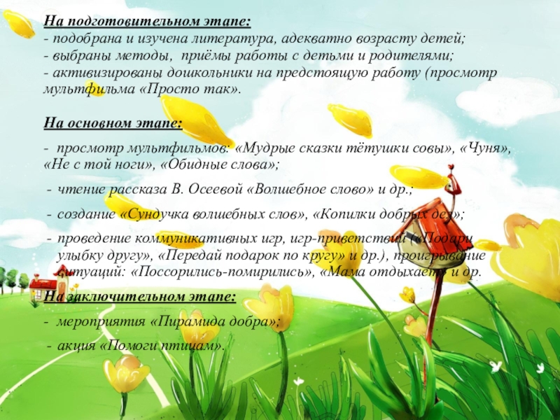 - просмотр мультфильмов: «Мудрые сказки тётушки совы», «Чуня», «Не с той ноги», «Обидные слова»;
