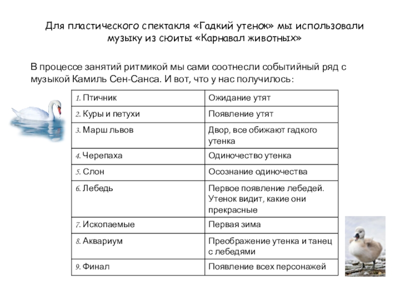 В процессе занятий ритмикой мы сами соотнесли событийный ряд с музыкой Камиль Сен-Санса. И вот, что у нас получилось: