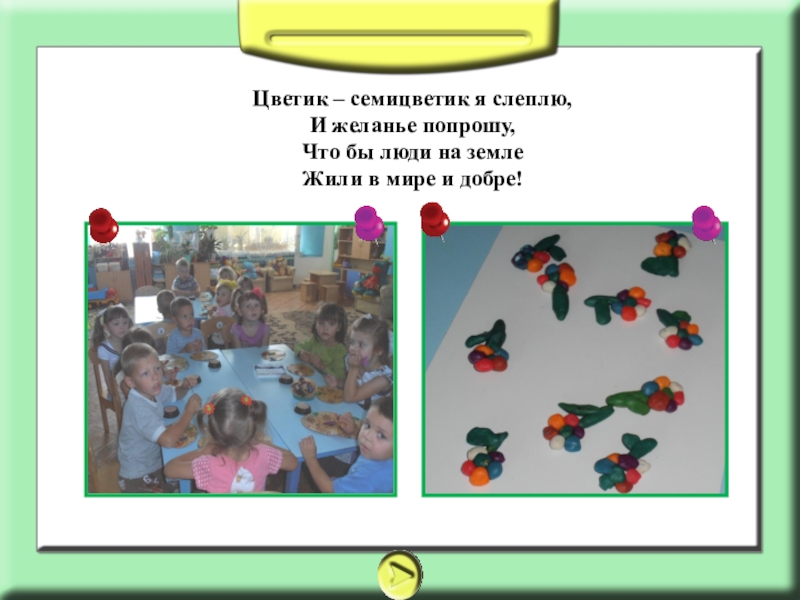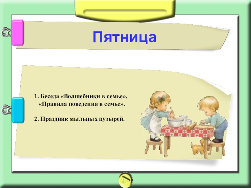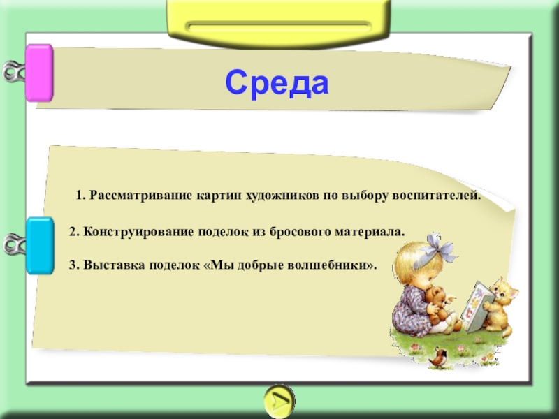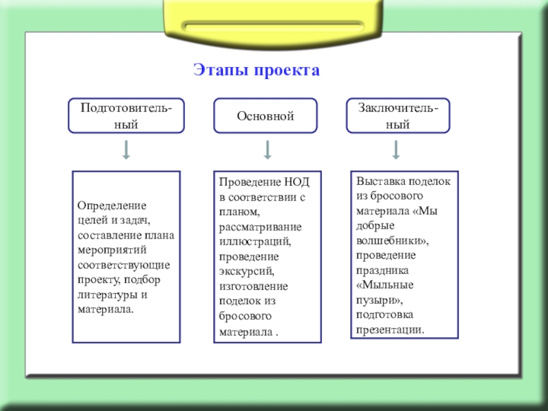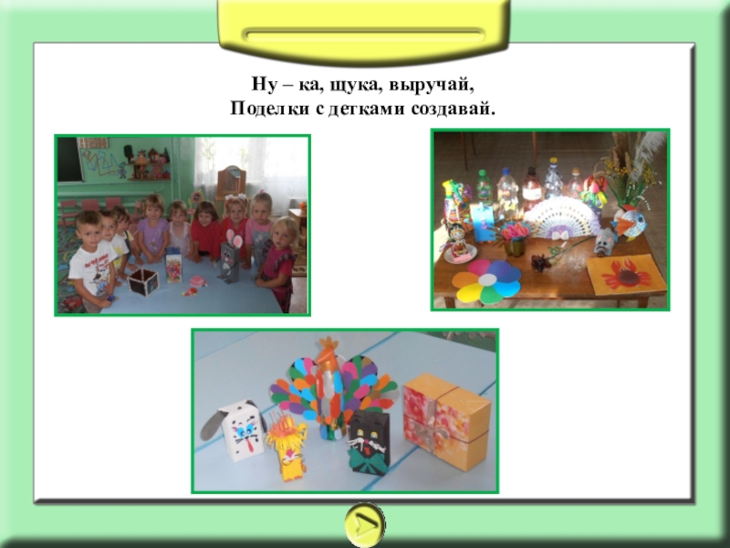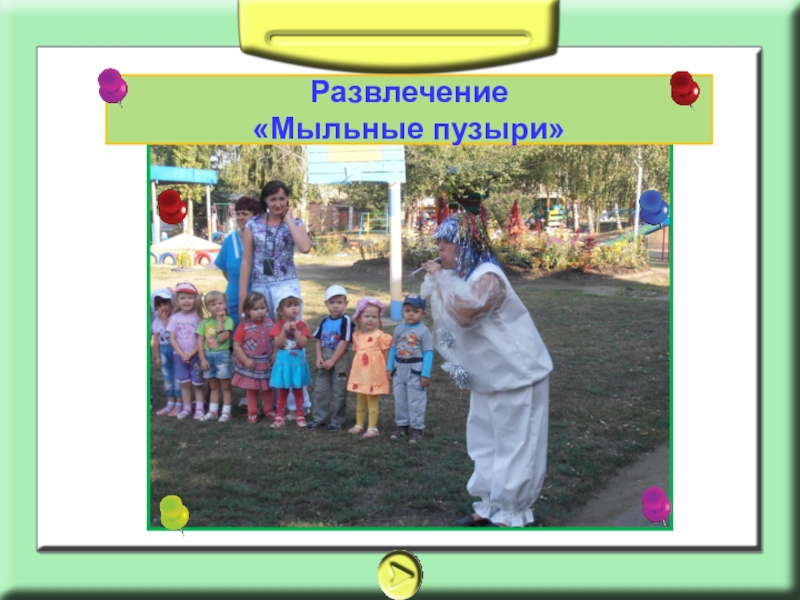 Выставка поделок из бросового материала «Мы добрые волшебники», проведение праздника «Мыльные пузыри», подготовка презентации.