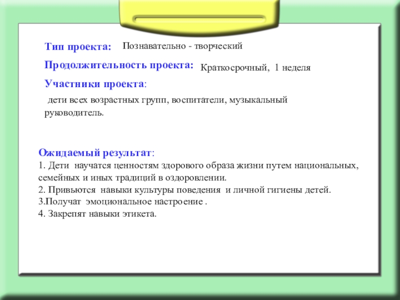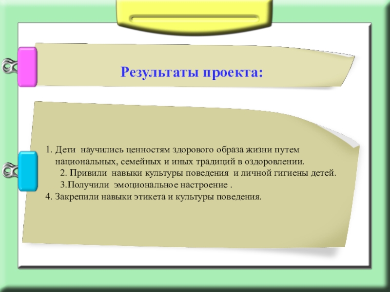 1. Дети научатся ценностям здорового образа жизни путем национальных, семейных и иных традиций в оздоровлении.