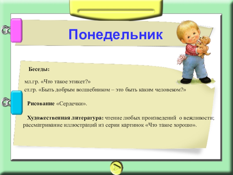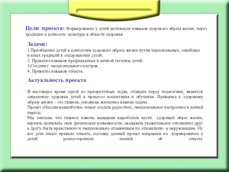 Мы считаем, что главное помочь малышам выработать вести здоровый образ жизни, научить оценивать свои физические возможности, оказывать уважительное отношение друг к другу, быть нравственно и эмоционально отзывчивым по отношению к окружающим. Не все дети знают правила этикета, поэтому данный проект направлен на формирование у детей разносторонних знаний об этикете.