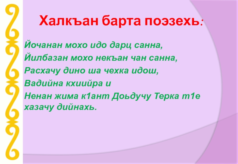 Слайд 19ШЕН НЕНАН МОТТ ХАЛКЪО СИЙ ОЙБУШ 1АЛАШБАХЬ. ЦУ ХАЛКЪАН ПАРГ1АТО ЦХЬАММО