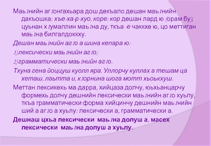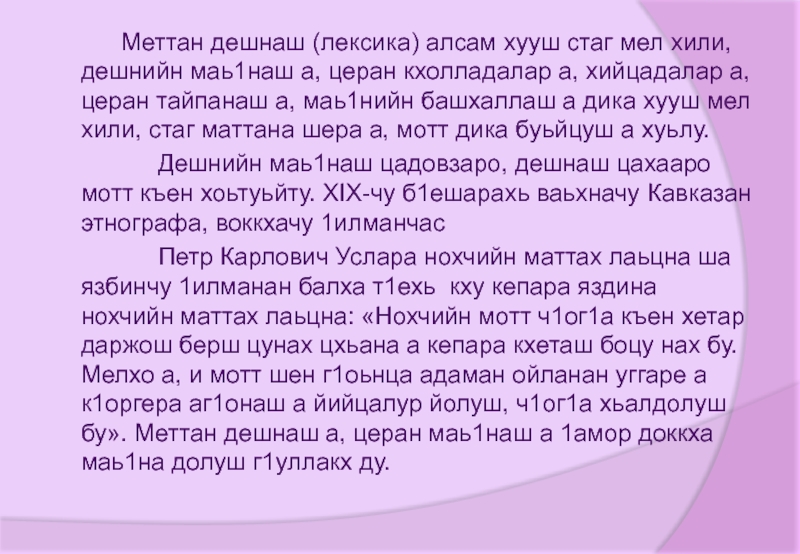 Слайд 2 Меттан дешнаш (лексика) алсам хууш стаг мел хили, дешнийн маь1наш а,