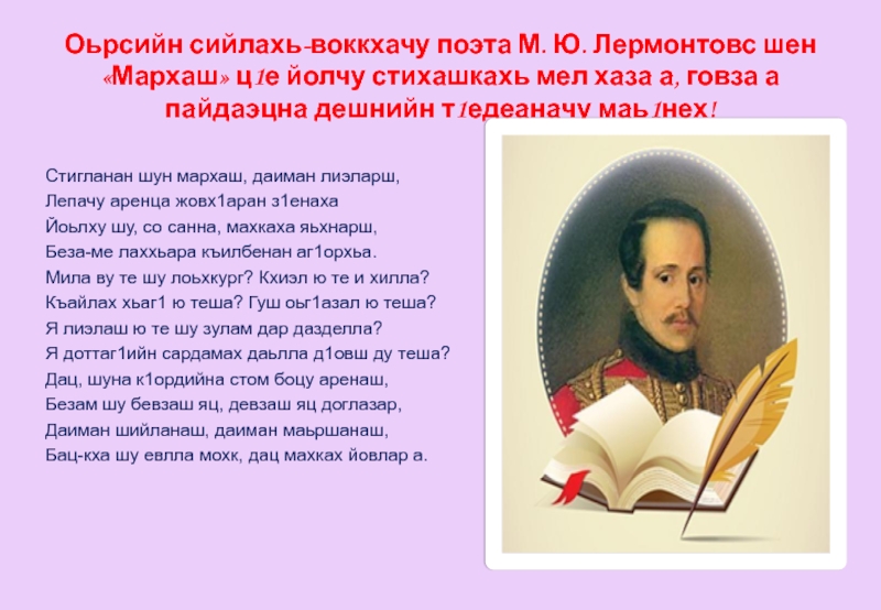 Слайд 17Оьрсийн сийлахь-воккхачу поэта М. Ю. Лермонтовс шен «Мархаш» ц1е йолчу стихашкахь