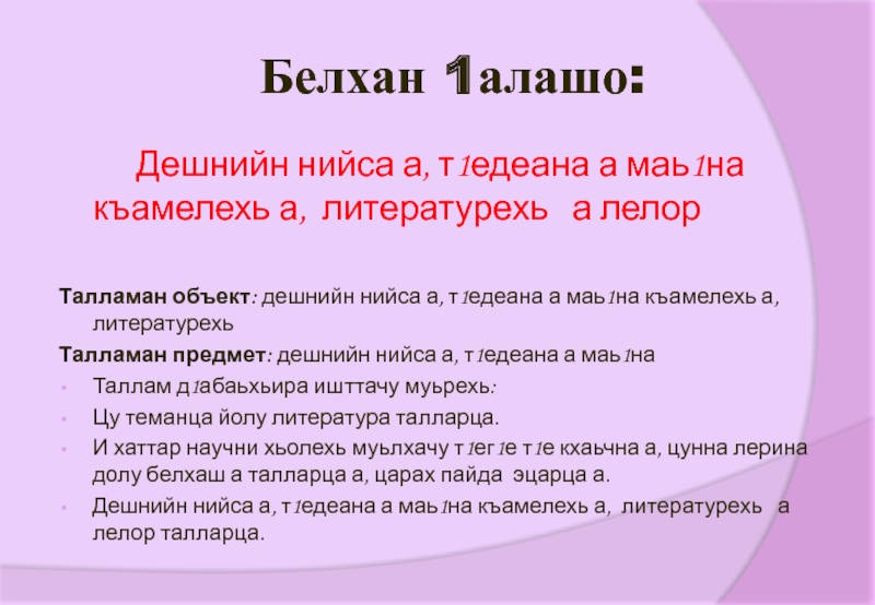 Талламан объект: дешнийн нийса а, т1едеана а маь1на къамелехь а, литературехь