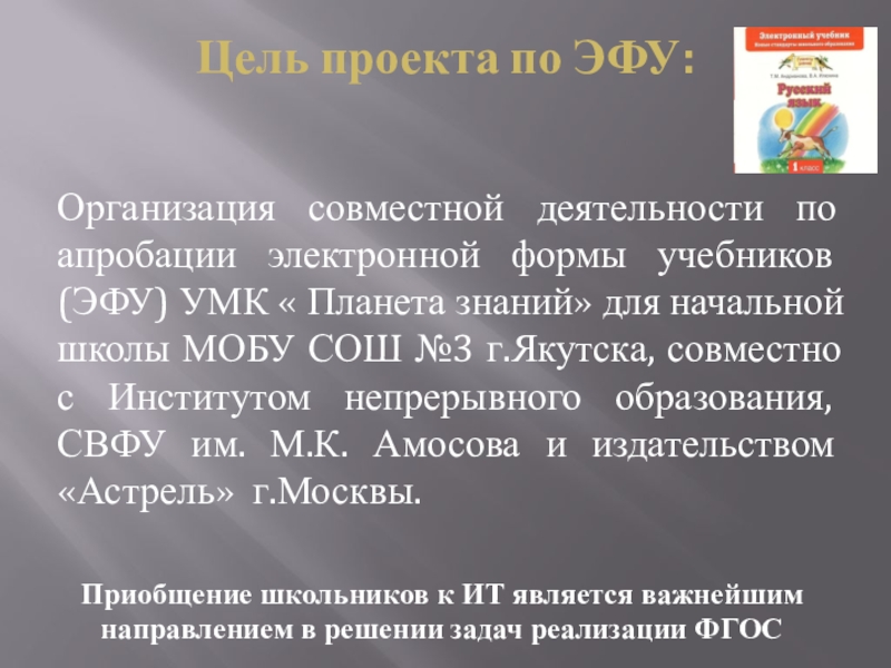 учебников (ЭФУ) УМК « Планета знаний» для начальной школы МОБУ СОШ №3 г.Якутска, совместно с Институтом непрерывного образования, СВФУ им. М.К. Амосова и издательством «Астрель» г.Москвы.