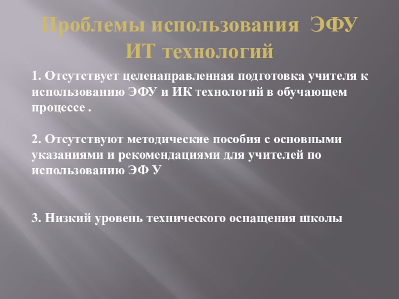 1. Отсутствует целенаправленная подготовка учителя к использованию
