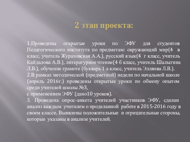 3. Проведена опрос-анкета учителей участников ЭФУ, сделан анализ каждым учителем о проделанной работе в 2015-2016 году в своем классе. Выявлены положительные и отрицательные стороны, которые указаны в анализе учителей.
