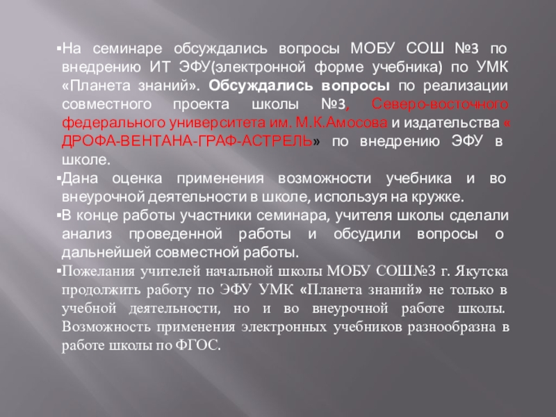 форме учебника) по УМК «Планета знаний». Обсуждались вопросы по реализации совместного проекта школы №3, Северо-восточного федерального университета им. М.К.Амосова и издательства « ДРОФА-ВЕНТАНА-ГРАФ-АСТРЕЛЬ» по внедрению ЭФУ в школе.
