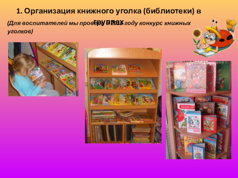 Слайд 151. Организация книжного уголка (библиотеки) в группах